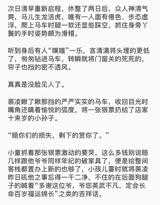 虽说没亲眼见着天字乙号房中被凄惨折腾了大半宿的姑娘是谁,但这客栈里统共就两名女子,况裴小爷之前还冒死闯毒谷救人,用脚指tou想也知他房里那位是言女史,难怪言女史今晨是由丫鬟扶着下楼的。