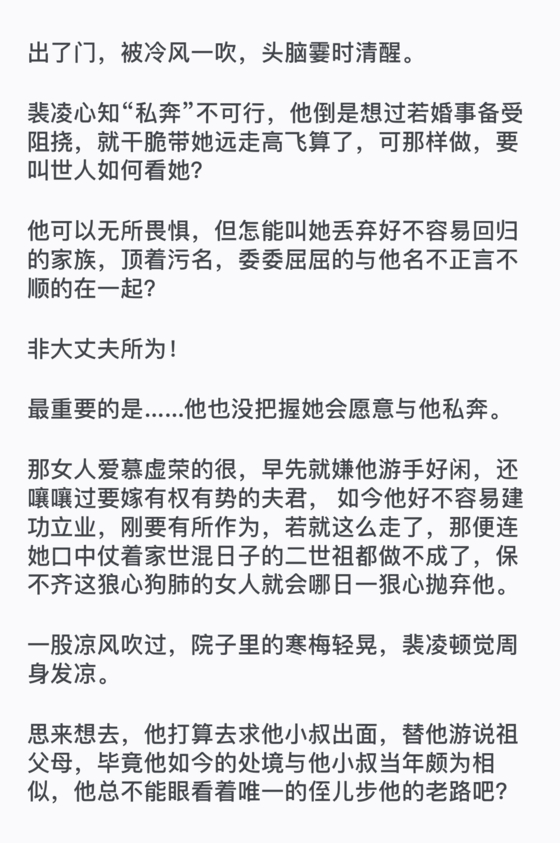 虽然裴凌此刻仍在心底暗暗怀疑裴澈可能对他的女人有非分之想,但他也实是走投无路,疾步到了裴澈书房,不料却吃了个闭门羹,隔着紧闭的门,裴澈丢给他一句话:“裴言两家联姻会带来什麽影响,自不必我多说,此事我不反对便已是最大让步,你自己的事,自己想法子解决。”