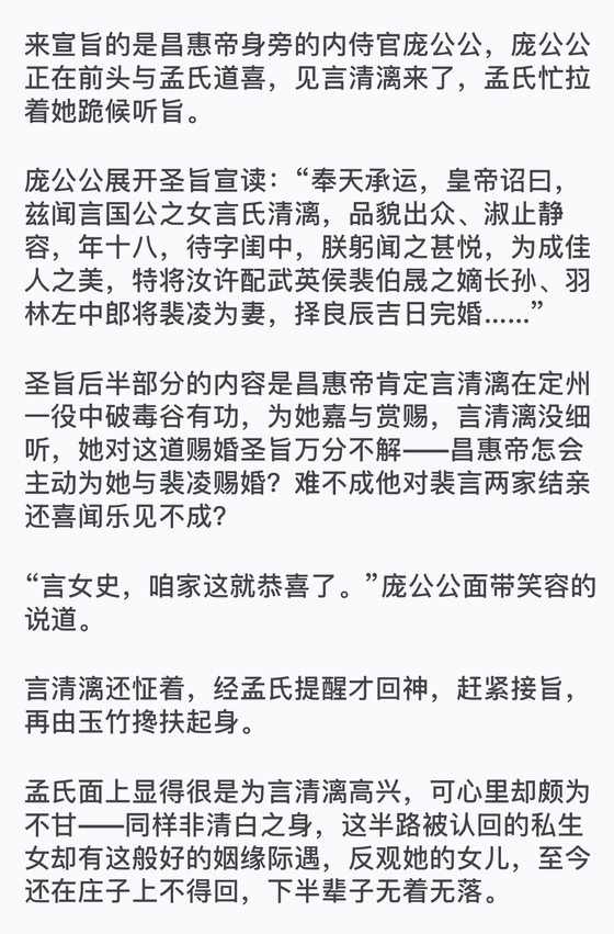 孟氏一边在心里叹言清漓好命,一边更加坚定要赶紧穩固住自己的地位,如此便还有机会替她的婉儿也寻一门妥当亲事。