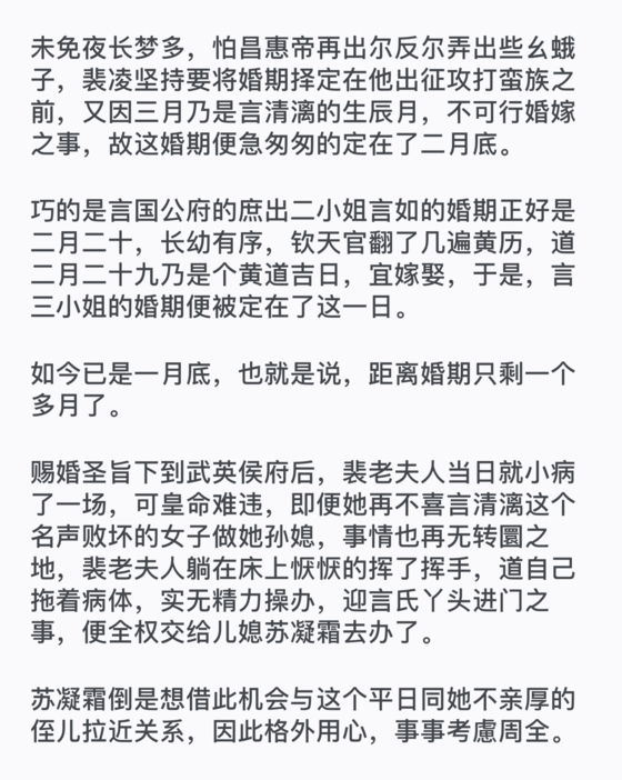想起今日从那些窃窃私语闲谈的婢子们嘴里听到的消息,裴冲鼓起勇气问裴澈:“父亲,清漓小姨是不是要嫁给大哥了?那……她以后就是冲儿的嫂嫂了吗?”