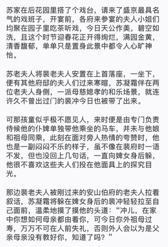 “冲儿若觉得听戏无趣,外祖母让下人带你去喂鱼可好?开春时你舅舅弄回来几条金鲤,就养在池塘里呢。”苏老夫人慈爱地搂过裴冲,暗暗地向苏凝霜递了个眼色,大抵是有什麽话想与她说,却又不想裴冲听到。