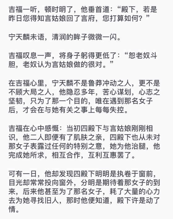 可他之后又留意过,那言姑娘虽然也对殿下关心有加,有时情动至极,还会留宿至天明,可她眼里却从未许久地停驻过殿下的shen影。