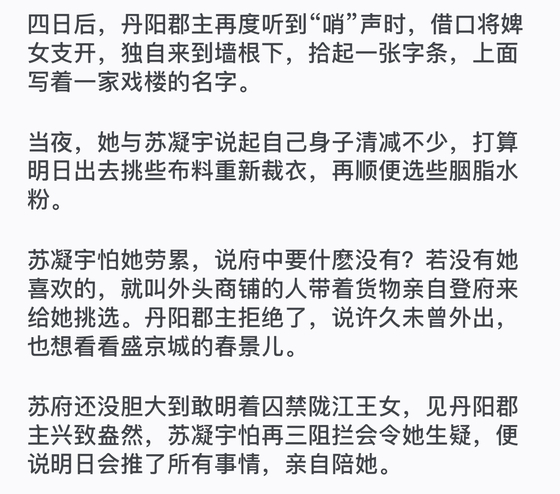 次日一早,丹阳郡主轻车简从,只带着婢女彩屏与几名侍卫出了苏府。苏凝宇的手下暗中跟了一阵后来报,说郡主先去了首饰铺打了首饰,又去往胭脂铺选了胭脂与香料,这会儿正要去满福楼用午膳,之后还要去成衣铺挑布料。
