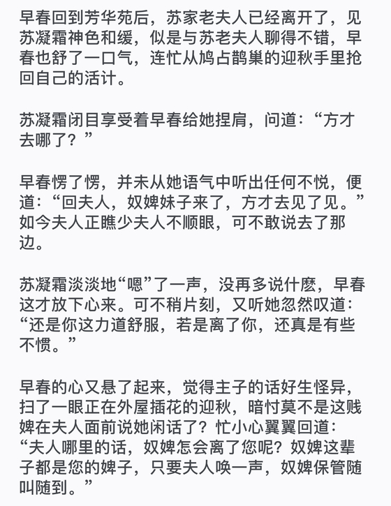 早春这才恍然回神,千恩万谢,又一想自己服侍夫人多年,除了这近一年来挨了些责打外,其他时候夫人确实待她算不错。眼眶一红,便发誓自己就算嫁了人,也会一辈子奉夫人为主。