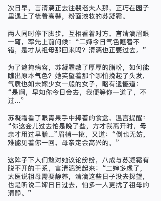 自打解了禁足后,苏凝霜对她的态度就有了微妙变化。客气仍是客气的,眼里却藏了敌意,言语中也多有暗讽,若换个心大的,恐怕都听不出来。