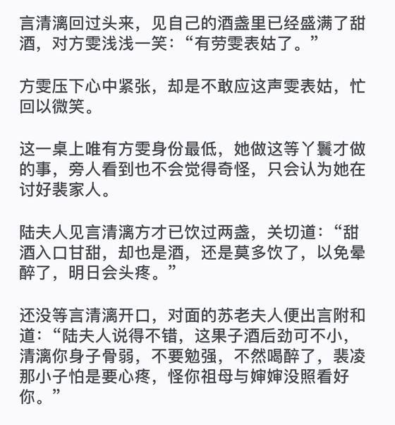 方雯离得近,看到了她神情上的细微变化,正心慌着,便见她下一瞬又仰起脖颈,饮了那甜酒。