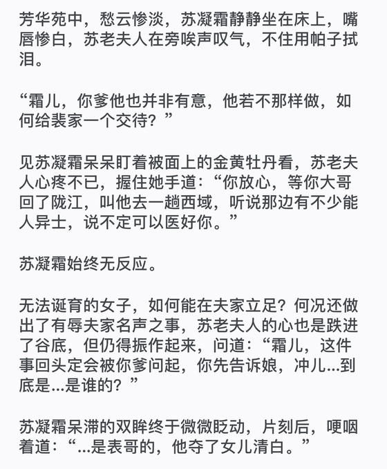 苏凝霜痛苦地闭上眼,打断苏老夫人的话:”娘,子阳从未碰过女儿!”