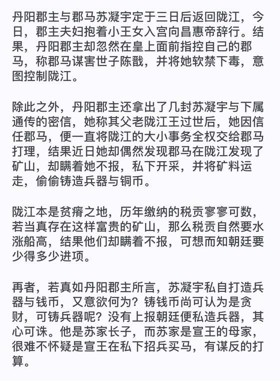 他毫无防备,只能向昌惠帝辩称丹阳郡主乃一派胡言,矿山之事老陇江王与丹阳郡主亦早已知晓,正是老陇江王起了贪念,不愿向朝廷缴纳税贡,才吩咐他不可声张,他只是按郡主吩咐zuo事。
