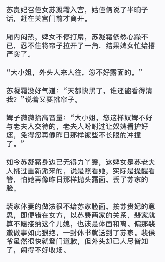 苏凝霜不再掀帘子了,沉着脸隐忍不发。那婢子睨她一眼,默默打扇,心想着一介弃妇还摆这般大的谱,多有看她不起。