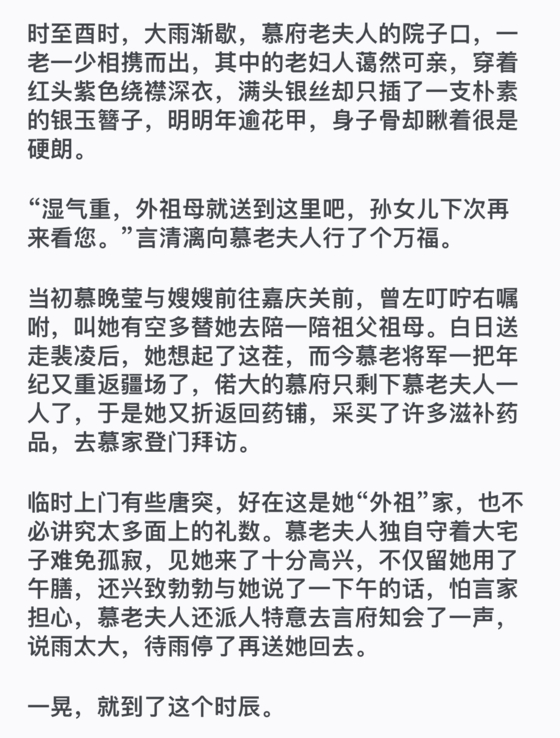 慕老夫人显然看出了她掩藏在客气表象下的疏离,以为她是因与慕家没有血缘关系才会拘束见外,故而对她掏心窝子说出了后来那番话。